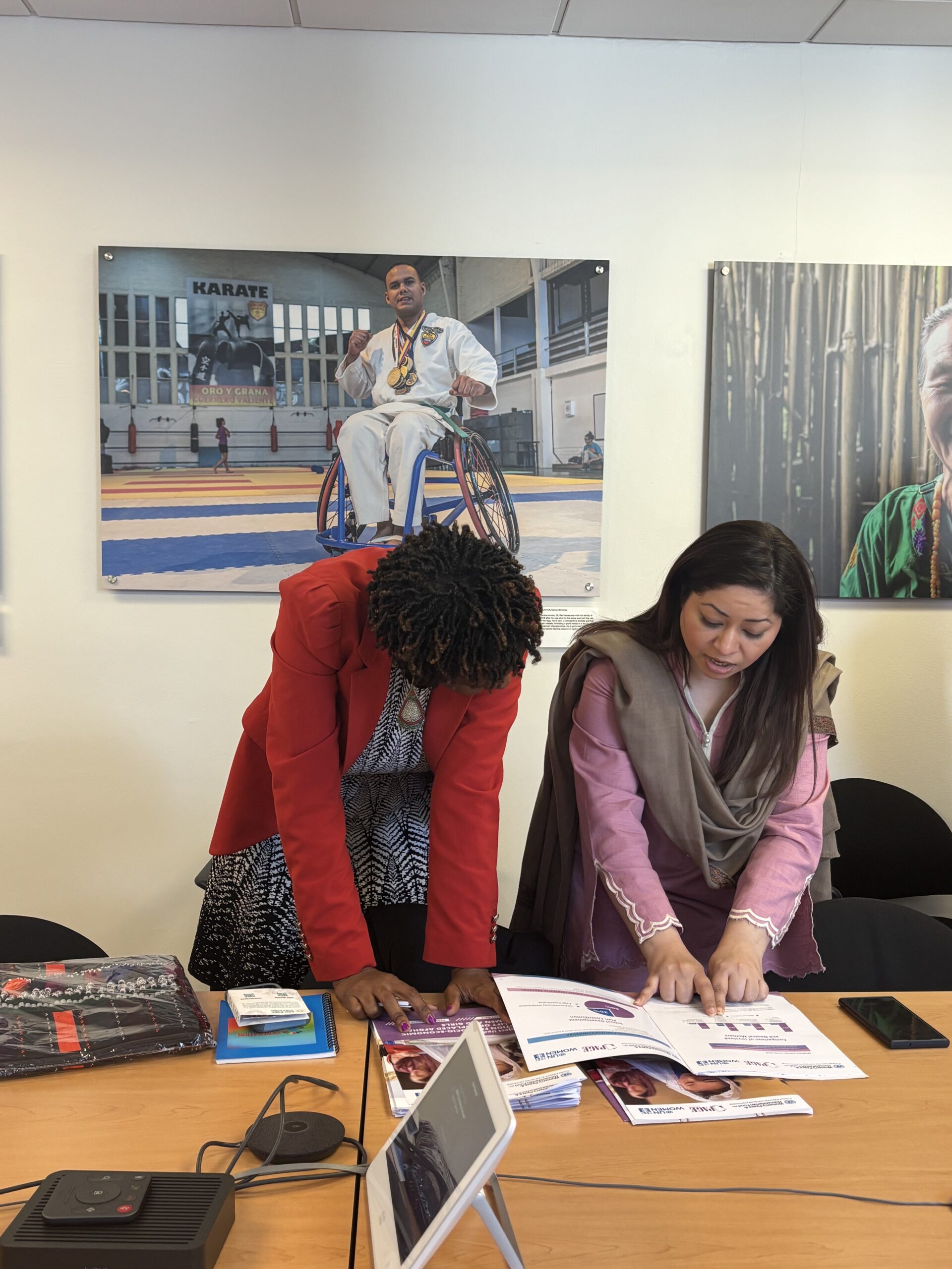 Fajer Rabia Pasha (right) presents the latest study by her organization, the Pakistan Alliance for Girls Education (PAGE), to WPHF Head of Secretariat Tonni Brodber (left) during a donor briefing held alongside CSW69. ©2025 WPHF